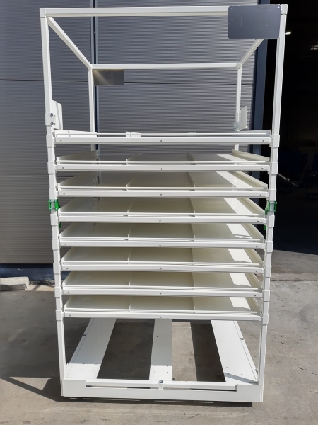 Nous vous proposons une gamme de racks métalliques avec des compartiments différents, organisés et modulables, des rangements intérieurs pouvant être réalisés en matière textile cousue avec soin chez nos partenaires, des rangements racks et plateaux métalliques ou des rangements sur rouleaux de caisses (Dynamic Rack), des tiroirs, des rangements avec barre transversale ou tube pour suspendre les pièces, même solution de stockage avec tube ou barre transversale avec mousse pour les pièces sensibles comme les composants électroniques.
